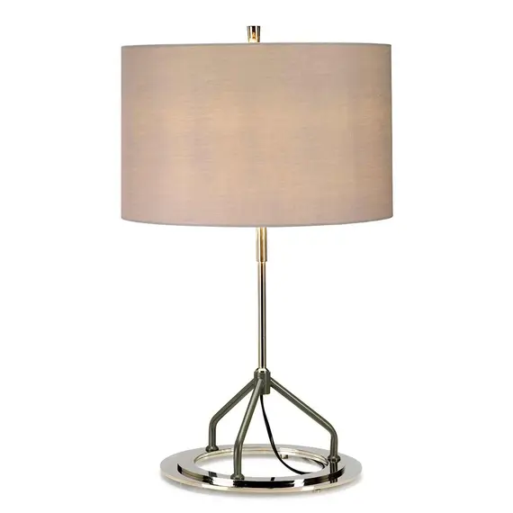 Vicenza table lamp is a Dark Grey tripod on a Polished Nickel base with hidden feet so the ring appears to hover above the table, complete with Grey cylinder shade that has a Metallic Silver lining and finial.